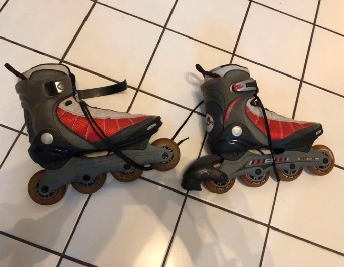 Die rot / grauen Rollerskates warten darauf, anderen eine Freude zu bereiten - bin leider rausgewachsen.