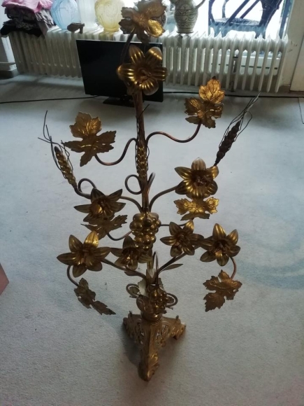 Es handelt sich hier um einen Ernte Dank Leuchter, der zu Ernte Dank Fest in der Kirche auf dem Altar aufgestellt wurde. Er ist aus feuervergoldetem Metall (ich meine Messing: