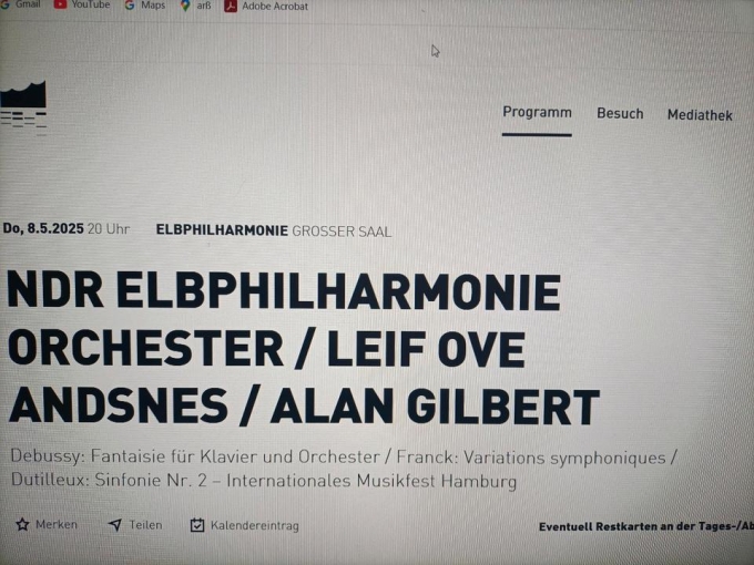 Ich biete hier 8 TOP- Tickets für das Konzert im Großen Saal mit Alan Gilbert am 08.05.25 in der Elbphilharmonie.