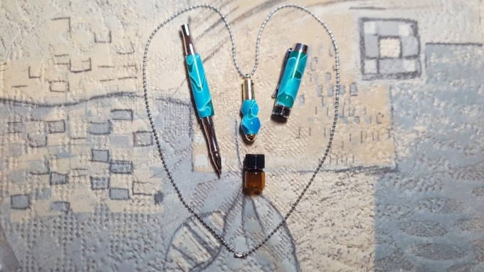 Rollerballschreiber mit Duftanhänger (ohne Duftstoff) und Kette zu verkaufen.