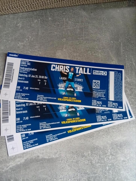 Verkaufe drei Karten für Chris Tall Daten bitte Karten entnehmen gerne auch einzeln Pro Karte 60 Euro es sind alle 3 noch da da hat. jemand abgesagt