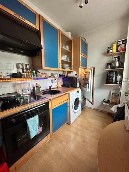 Küche: Die Wohnung ist bereits mit einer praktischen Einbauküche ausgestattet, die ich gerne zusammen mit den E- Geräten (Kühlschrank, Abluft, Ofen und Ceranfeld) für 400€ VHB abgeben möchte. Sie ist noch in einem super Zustand und bietet viel Platz.