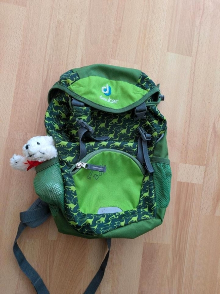 Ich verkaufe einen Kinderrucksack von Deuter, Modell Schmusebär, grün mit Dinos.