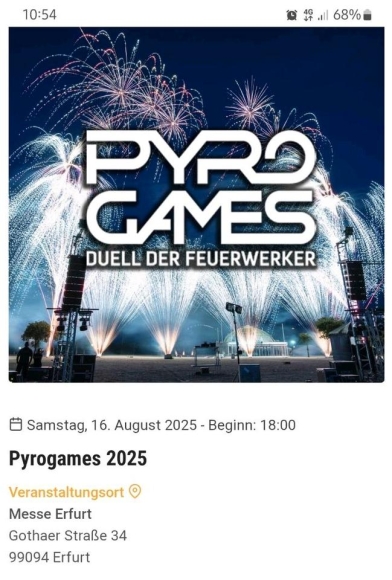 Leider muss ich unsere 4 Tickets für die Pyrogames abgeben da wir an diesem Tag zu einer Feier geladen sind :-/ Es handelt sich um Sitzplatz Tickets inklusive Fanpaket. (Regenponcho, Ohrstöpsel)