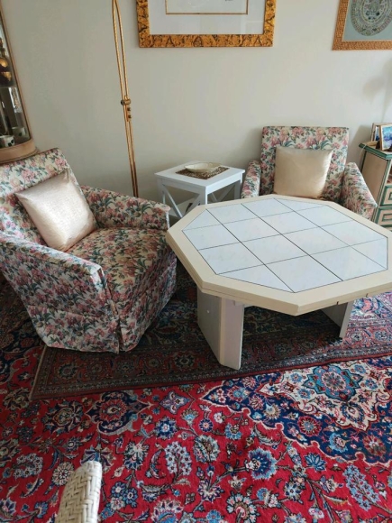 zwei Sessel mit Kissen, Blumenmuster und höhenverstellbarere Tisch, der auch noch ausziehbar ist. Pflegeleicht durch Fliesen und weißes Holz Zustand hervorragend.