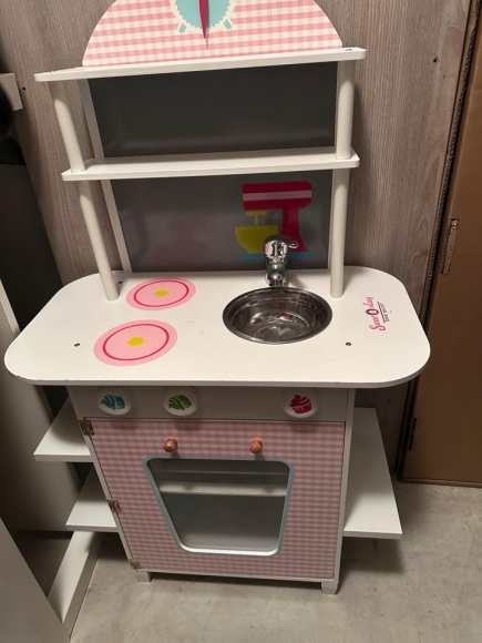 Süße kleine Küche mit Gebrauchsspuren aber noch voll funktionsfähig, graue Wand ist magnetisch.