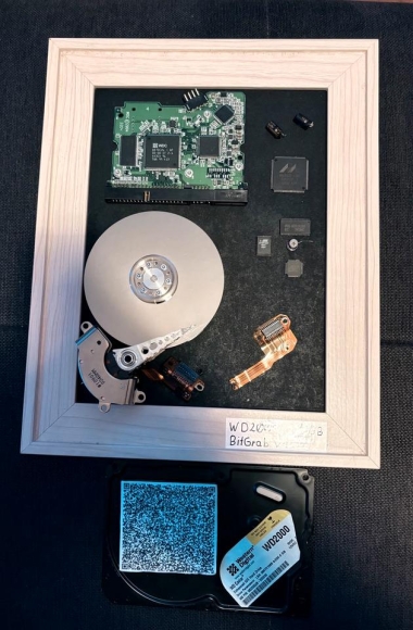 Kunstobjekt „BitGrab v1“ – Zerlegte Festplatte im Rahmen (Unikat)