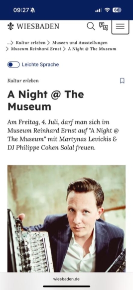 Wenn draußen die Dämmerung einsetzt, öffnet das Museum Reinhard Ernst in Wiesbaden noch einmal seine Türen für einen Museumsbesuch der besonderen Art: Unter dem Motto "Music meets Art" präsentiert unser Fokus- Künstler Martynas Levickis gemeinsam mit DJ Philippe Cohen Solal (Gotan Project) elektronische Klänge in der Fusion mit Tangomusik.