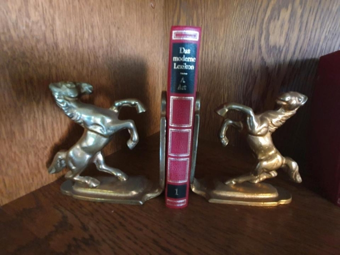 Zwei schwere Buchstützen aus Messing mit jeweils einem hochsteigenden Pferd