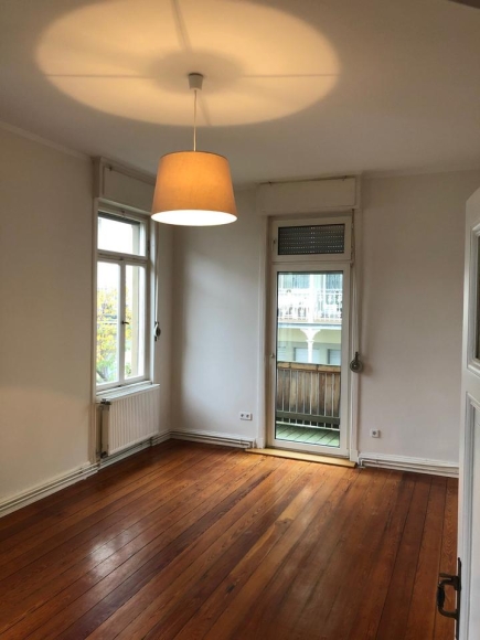 Die Wohnung weist schöne Altbaudetails auf (hohe Decken, Dielenböden, breite Türrahmen, Holz-Kassettentüren) und liegt in der ersten Etage (kein Aufzug) eines 3-Parteien-Hauses.
