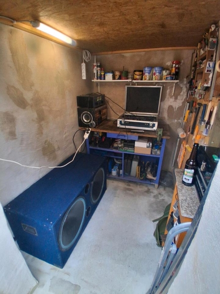 Zum Verkauf steht auch noch der kleine subwoofer links auf der Werkbank, der ist Eigenbau aber tut auch was er soll.