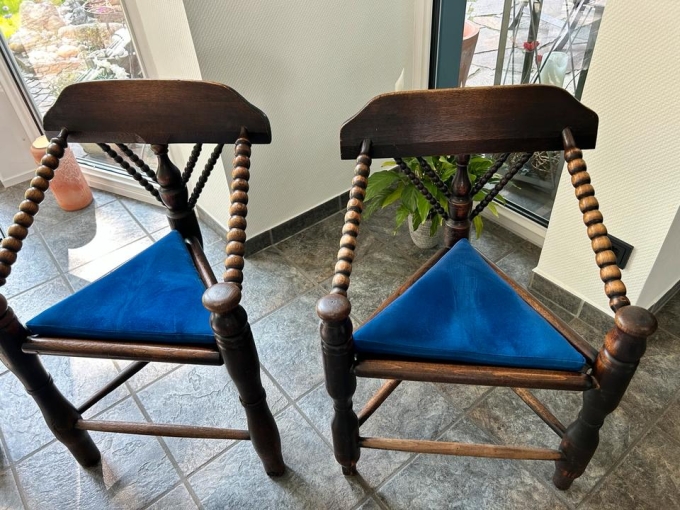 4 Eckstühle Jugendstil um 1900 aus Eiche gefertigt. Die nachträglich passend angefertigten Sitzkissen aus royal-blauem Alcantara bieten ein komfortables Sitzen. Die gedrechselten Stuhlbeine und Schnitzereien tragen sehr zum optischen Wert dieser Dreieckstühle bei. Altersgerecht gut erhalten.