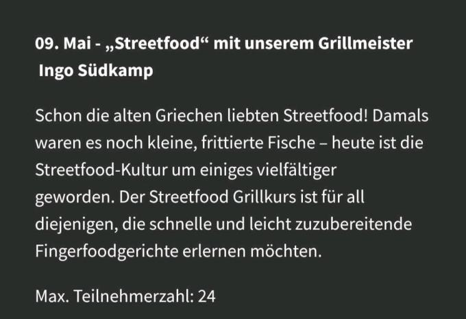 1 Karte für den 09. Mai 2025 ab 18 Uhr bei Nesemann in Syke für den Grillkurs "Streetfood" mit Grillmeister Ingo Südkamp. Die Karte kostet regulär 95€. Gebe ich gegen ein Gebot ab für jemanden der Spass daran hat. ich kann leider nicht.