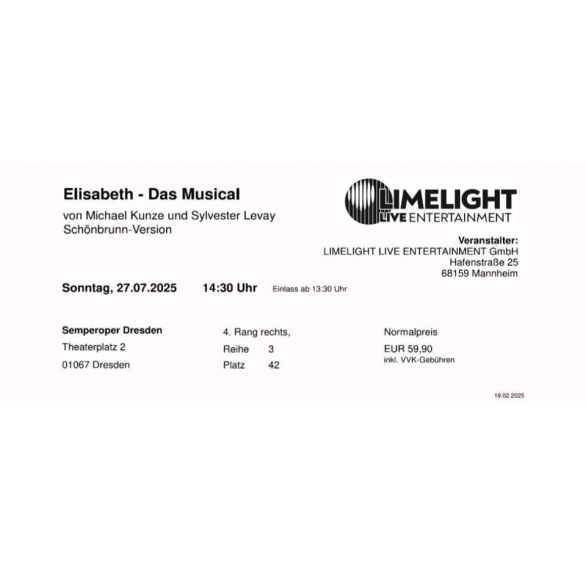 ich verkaufe 2 Tickets für die Elisabeth Tour in Dresden.