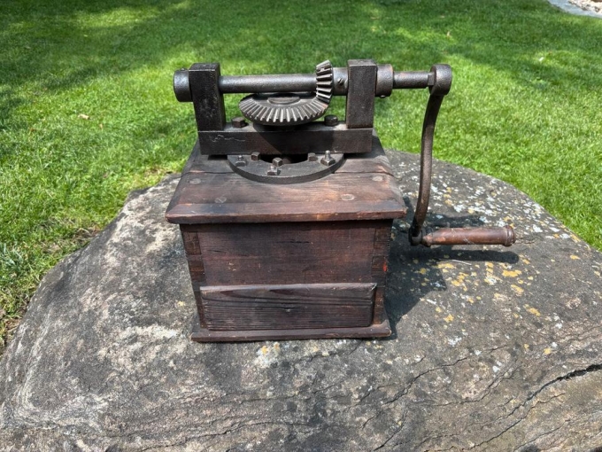 Es handelt sich um eine sehr gut erhaltene, antike, mechanische Kaffeemühle oder auch Getreidemühle mit Handkurbel.