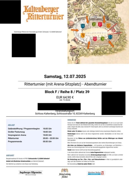 Ich verkaufe zwei Tickets für das Kaltenberger Ritterturnier am Samstag, den 12. Juli 2025. Die Tickets sind für zwei gute Arena-Sitzplätze. Leider kann ich aus zeitlichen Gründen nicht teilnehmen.