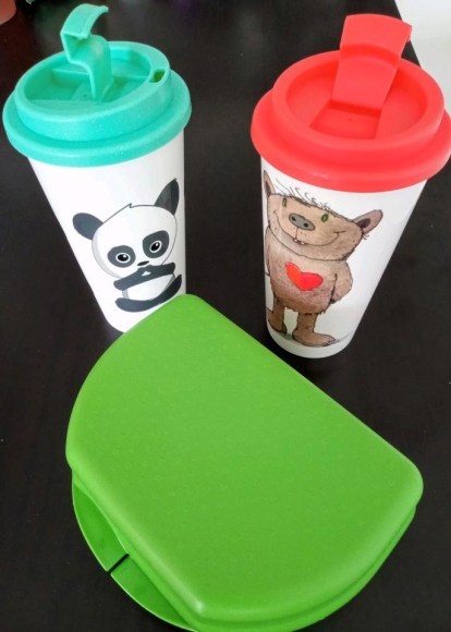 Die 2 süßen Coffee Becher sind mit Motiv, einmal Janosch von Bavaria Sonor Media de und ein mit nen Panda zudem gib es eine Brotdose grün von Tupperware dazu.