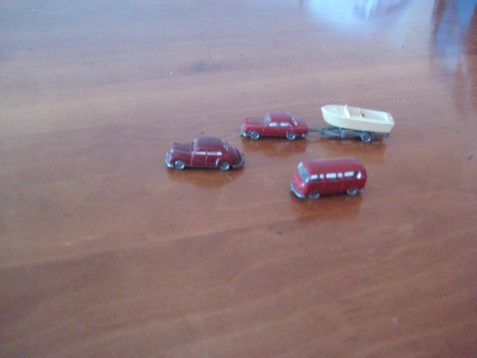 Es handelt sich um Wiking - Modellautos für Spur N : 1 Mercedes 280 mit Anhänger und Motorboot, 1 BMW 501 und 1 VW-Bus - lt. Foto.