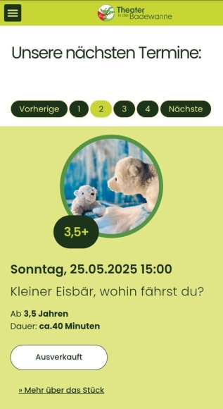 Ich biete 4 Tickets (2 Erwachsene, 2 Kinder) für das Puppentheater "Kleiner Eisbär, wohin fährst du?" am So, 25.5. im Theater in der Badewanne in Stuttgart-Killesberg. Die Vorstellung ist eigentlich ausverkauft.
