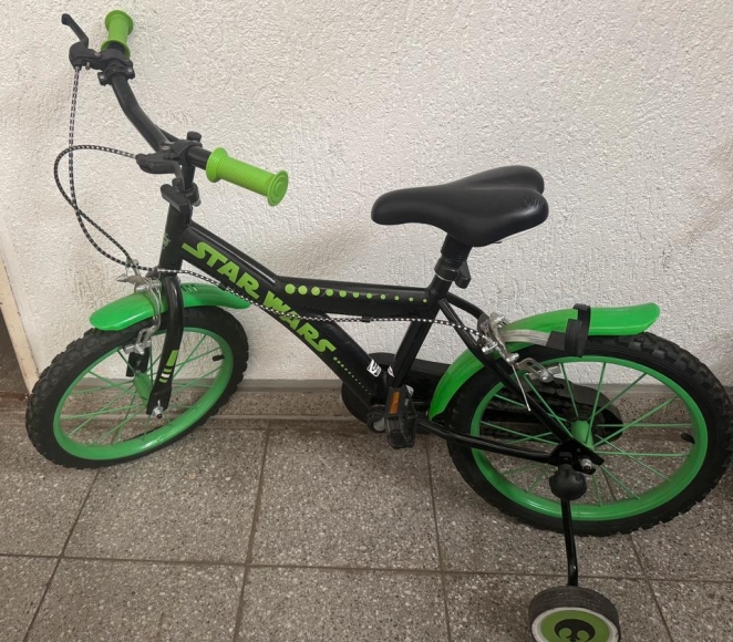Verkaufe ein cooles Star Wars Kinderfahrrad in Schwarz-Grün mit grünen Felgen und Griffen. Das Fahrrad ist in gutem Zustand und voll funktionsfähig. Ideal für kleine Anfänger – dank der stabilen Stützräder können Kinder sicher das Fahrradfahren lernen.