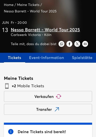 Verkaufe Krankheitsbedingt zwei Karten für das Nessa Barrett Konzert. Über Ticketmaster, die Tickets würden direkt auf den neuen Käufer übertragen werden.