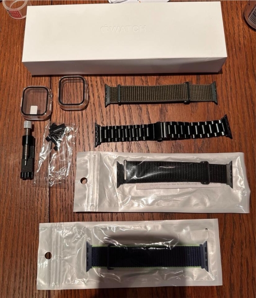 Zudem gehören die gebrauchte Schutzhülle, eine neue ungebrauchte Schutzhülle, das Originalzubehör (Band & Kabel ) 4 zusätzliche Bänder, zwei Bänder davon sind ungebraucht. 1 Band ist ein normales schwarzes Gliederband mit verstellbarer Größe (Teile zum verkleinern/vergrößern sind dabei)