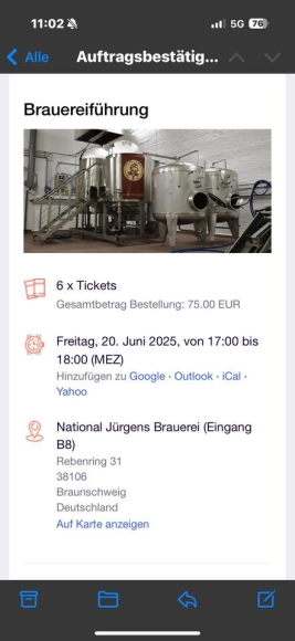 Ich biete hier 6 Tickets für eine Führung samt Verkostung in der national Jürgens Brauerei in Braunschweig an.