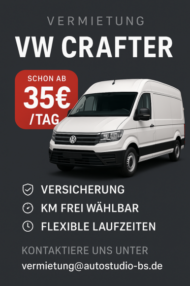 Du suchst ein geräumiges, zuverlässiges Fahrzeug für deine Transporte, Umzüge oder als Firmenwagen? Dann ist unser VW Crafter genau das Richtige für dich!