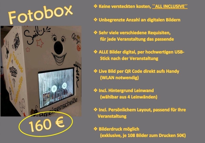 Wir vermieten ua eine Fotobox. Dieser wird komplett mit allen drum und dran vermietet. Keine versteckten kosten.
