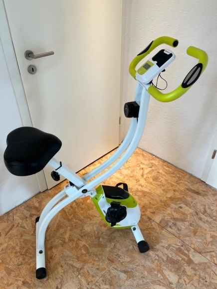* TECHNISCHE DETAILS: Maße des Fitness-Bike (L x B x H): aufgestellt ca. 80 x 45 x 121 cm, zusammengeklappt ca. 30 x 45 x 142 cm – geeignet für Benutzer mit einem Gewicht bis zu 110 kg – Farbe: weiß grün