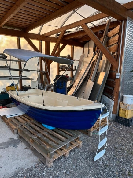 Das GFK Boot hat eine neue Grundierung bekommen und wurde neu lackiert. Das Boot ist sofort fahrbereit. Dach, Anker etc. gibt es mit dazu.