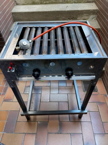 Gastrobräter aus Edelstahl von Enders; mit Untergestell; 2 flammig; 10 KW; mit Bratpfanne; Gasanschluss und Druckminderer; Maße mit Gestell ca. 90 cm hoch; Bratfläche 56*46 cm; nur Abholung möglich;