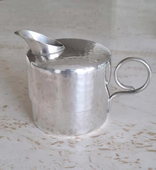 Kleines versilbertes Kännchen aus der Zeit des Art Deco von WMF. Die Punze befindet sich unterhalb des Griffes (siehe Foto). Maße: Ca. 6,5cm Durchmesser x 8cm Höhe. Guter Vintage Zustand.