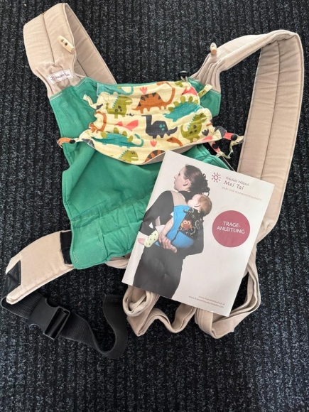 Waschbare und verstellbare Half-buckle Trage mit Sonnenschutz und Dino Muster. So verstellbar dass sie Mutter und Vater in aller Regel tragen können. Tierfreier Nicht-Raucher Haushalt.