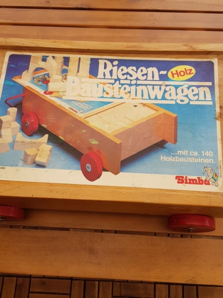 Ich biete einen alten Bausteinwagen aus Holz der Firma Simba (ca. 20 Jahre alt) zum hinterherziehen mit ca. 140 Bausteinen
