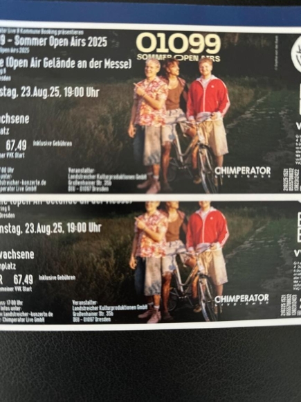 Verkaufe 2 Karten für das 01099 Openair in Dresden. Da ich leider nicht kann.