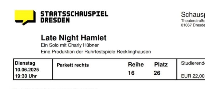 Ticket ist für Studierende , kann aber an der Abendkasse in ein reguläres Ticket, gegen entsprechenden Aufpreis, getauscht werden.