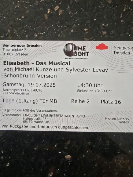 2 x Tickets 19.07.25 Elisabeth - Das Musical Semperoper Dresden