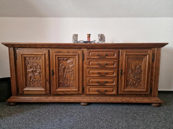 Zum Verkauf steht eine außergewöhnlich schöne, antik anmutende Kommode aus massivem Holz (Eiche), verziert mit aufwendig gearbeiteten Schnitzereien. Dieses Möbelstück verbindet rustikale Eleganz mit praktischer Funktionalität und ist ein echter Blickfang in jedem Wohnraum.