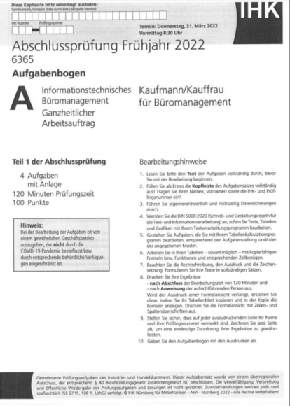 Ich verkaufe eine Original Abschlussprüfung Teil 1 für den Ausbildungsberuf Kauffrau/Kaufmann für Büromanagement. Die Prüfung ist von Frühjahr 2022, Version A.