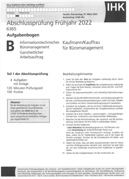 Ich verkaufe eine Original Abschlussprüfung Teil 1 für den Ausbildungsberuf Kauffrau/Kaufmann für Büromanagement. Die Prüfung ist von Frühjahr 2022, Version B.