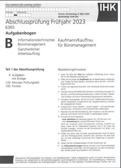 Ich verkaufe eine Original Abschlussprüfung Teil 1 für den Ausbildungsberuf Kauffrau/Kaufmann für Büromanagement. Die Prüfung ist von Frühjahr 2023, Version B.