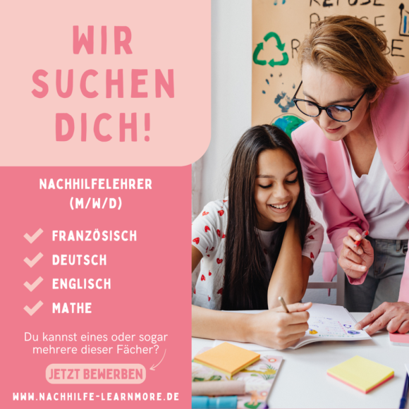 Für unsere Nachhilfeschule suchen wir für die Standorte Holtland und Detern engagierte Lehrkräfte oder motivierte Quereinsteiger für die Fächer Französisch, Mathematik, Deutsch und Englisch, die Spaß an der Arbeit mit Kindern und Jugendlichen haben.