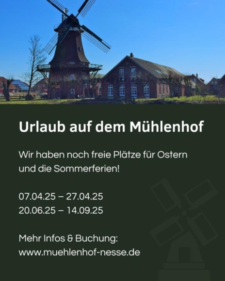 Bei uns auf dem idyllischen Mühlenhof an der Nordsee sind noch Plätze verfügbar!