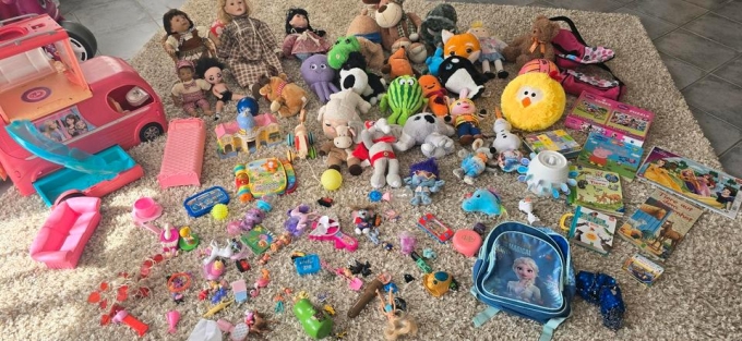 Dabei sind Kuscheltiere( Dinosaur macht Geräusch, Elch spricht nach) , Puzzle, Bücher , porzellan puppen, Rucksack, Spielen , Baby Schale mit Tasche , Barbie wohnmobil mit Zubehör ( ein wand fehlt ), lichtkette , Klein Spielzeug, Bälle .