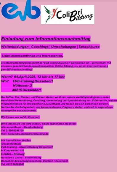 Hallo zusammen, wir bieten am 4 april einen unverbindlichen Informationsnachmittag an wo alle Interessierten Personen eingeladen sind die sich gerne beraten lassen würden und etwas über unsere Weiterbildungen Umschulungen und Deutsch Sprachkurse sowie bewerbungs und Karrierecoaching erfahren möchten. Wir würden uns freuen wenn Ihr vorbeikommt, nur eine Bitte, meldet Euch vorher an zu unserer besseren Planung.