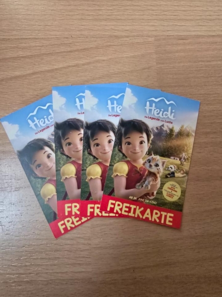 Wir haben 4 Freikarten für den neuen Kinofilm "Heidi" bekommen. Da unsere Kinder aber kein Interesse mehr an dem Film haben, geben wir sie weiter. Abholung Erfurt/Weimar, Zusendung Code oder Versand für 1 Euro sind möglich.