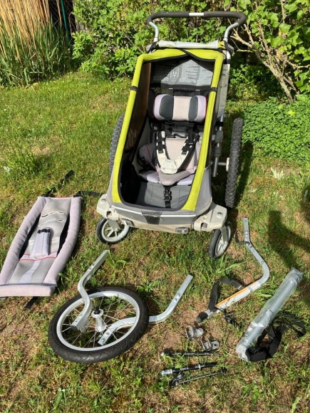 Wir verkaufen unseren Fahrradanhänger von Chariot (wurde von Thule übernommen) für ein Kind in grün.