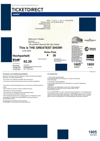 18. Mai 2025, 13:30Uhr Oberhausen Reihe 4 Platz 36,37 Hochparkett