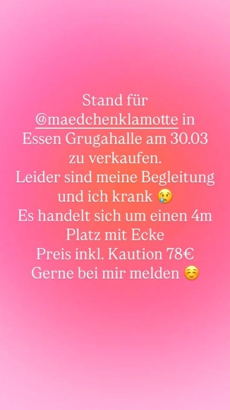 Ich muss aus gesundheitlichen Gründen meinen Standplatz für die Mädchenklamotte am 30.03 in Essen in der Grugahalle abgeben.
